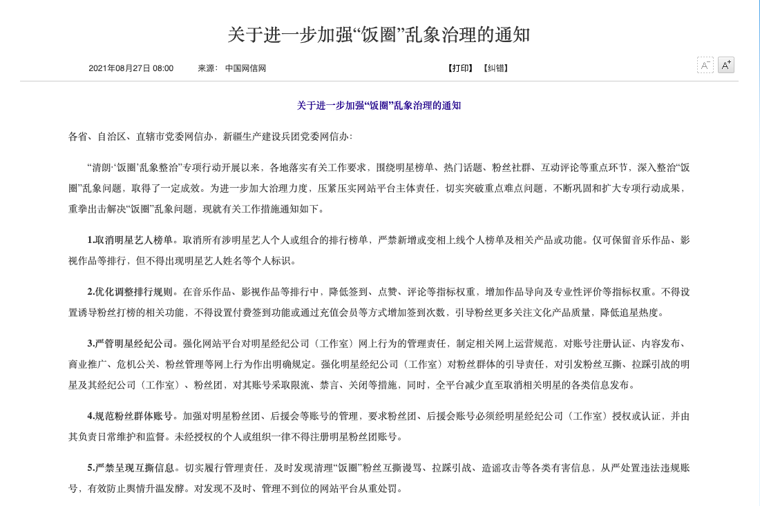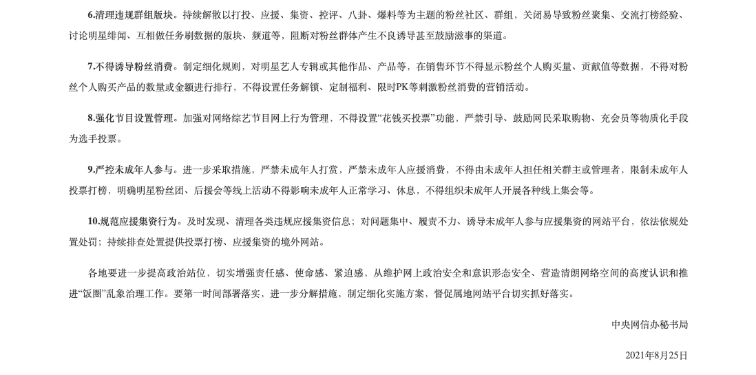 中央网信办近日发布《关于进一步加强“饭圈”乱象治理的通知》通知提出,取消明星艺人榜单,从严处置违法违规账号,严禁新增或变相上线个人榜单及相关产品或功能;严禁呈现互撕信息,及时发现清理“饭圈”粉丝互撕谩骂、拉踩引战、造谣攻击等各类有害信息,从严处置违法违规账号等。