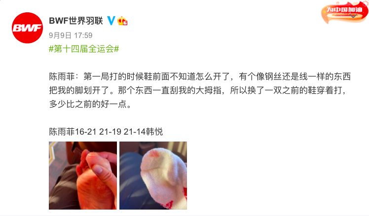 陈雨菲刚在8月初东京奥运中夺得金牌,9日透过世界羽联的微博发文,透露在比赛第一局时,鞋子因为不明原因裂开,有个似钢丝东西将她脚掌的大拇指划开,脱下袜子才发现大拇指有道深深的割痕且都是血,赶紧换了双鞋子才能够继续比赛。
