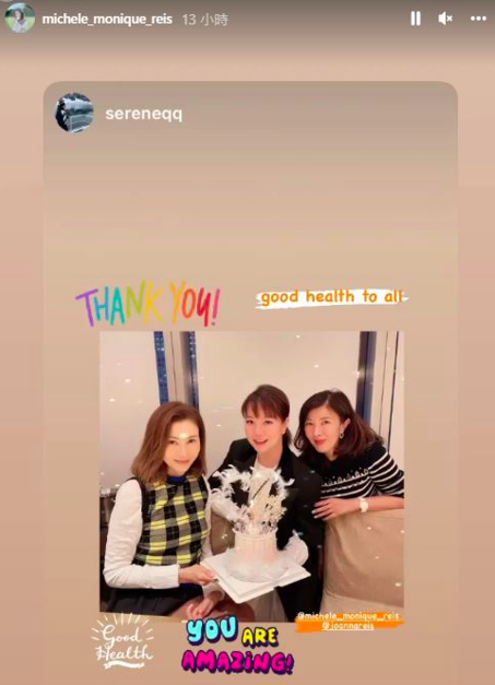 她昨晚在IG Story转发好友发文,李嘉欣与姐姐李嘉明及好友手捧精美蛋糕合照。