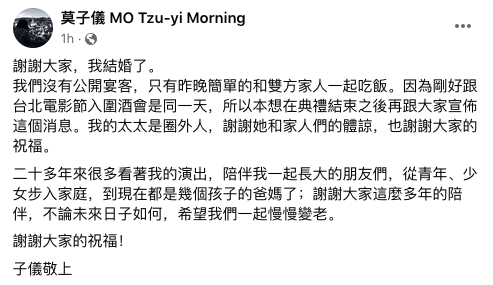 金马影帝莫子仪在脸书公布结婚喜讯!