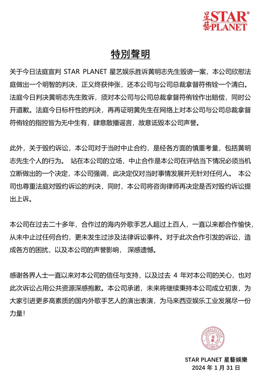 双方较后也就判决各自发表声明,星艺娱乐在声明中说,对于胜诉黄明志毁谤一案,该公司欣慰法庭做出明智判决,还公司与公司总裁拿督符侑铨一个清白。
