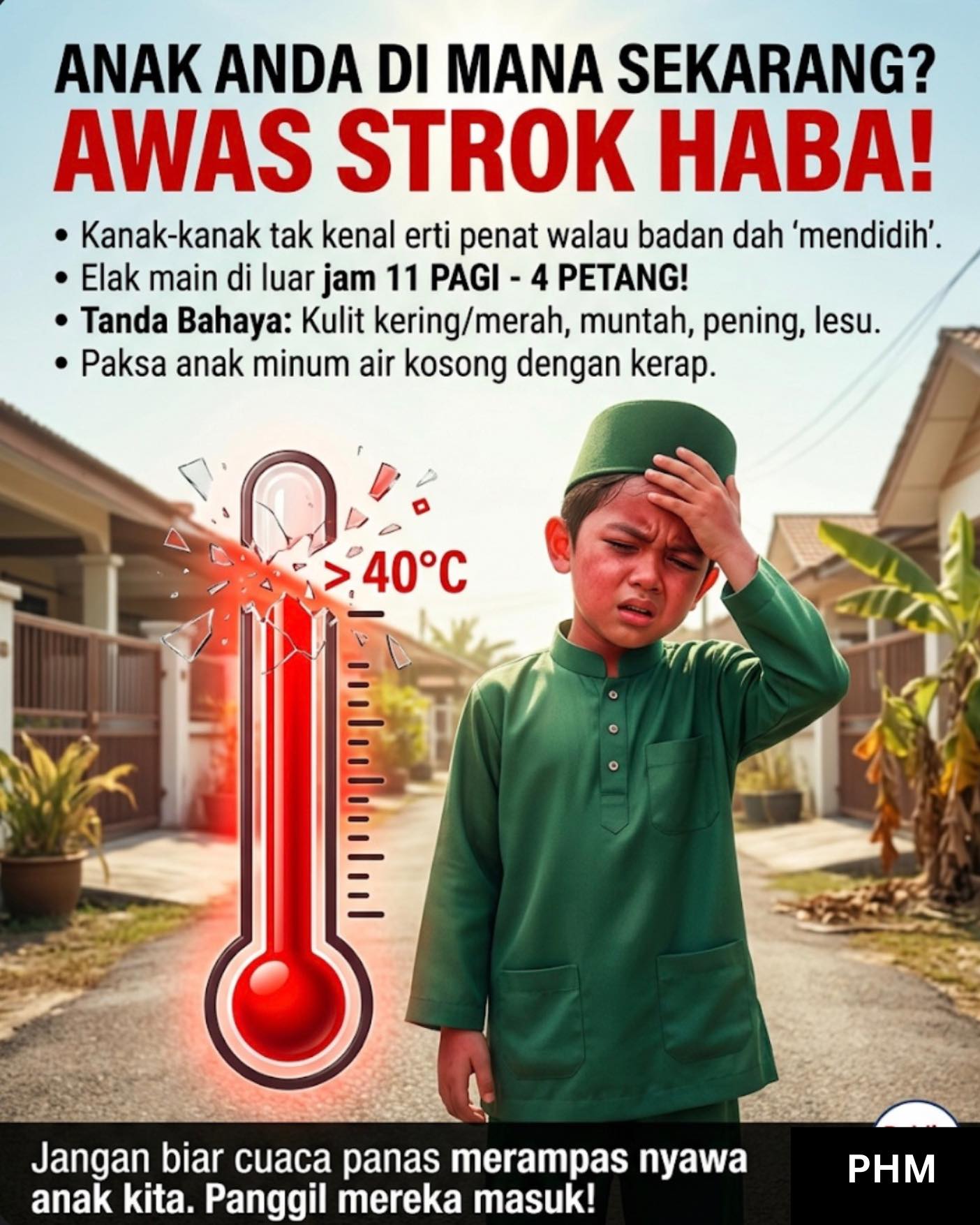 近期天气酷热,大马公共卫生资讯专页提醒家长,提高警惕,避免孩童长时间暴露在烈日下,以防中暑引发致命热射病。