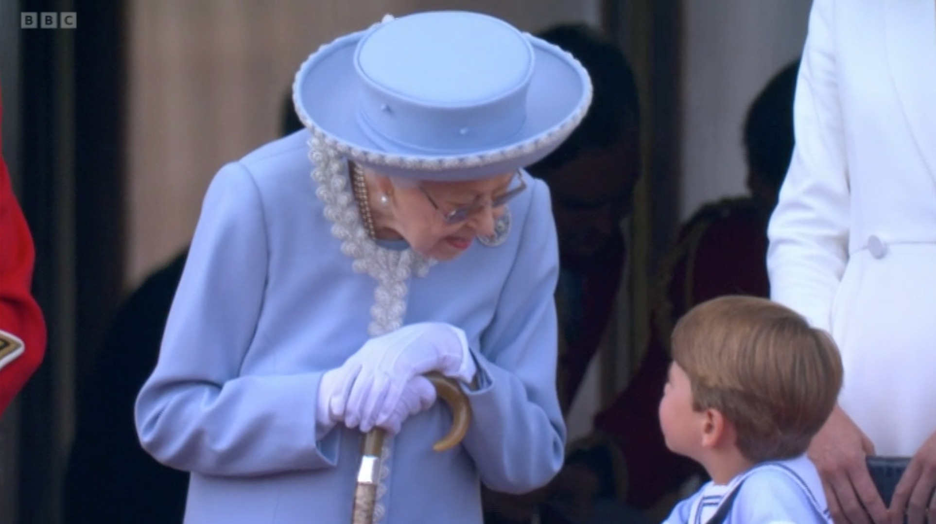 英国《每日邮报》报导,4岁的路易王子和哥哥乔治王子及姐姐夏洛特公主一起在露台观看军机飞行表演时,因为空中传来的声音嘈杂,双手捂耳大叫,96岁的伊丽莎白二世女王似乎被路易扮鬼脸、挖鼻孔的滑稽动作逗乐,俯身与这个小不点皇室成员交谈。