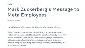 脸书母企Meta证实大裁员!超过13%11000名员工被裁,同时将冻结招聘至明年首季!