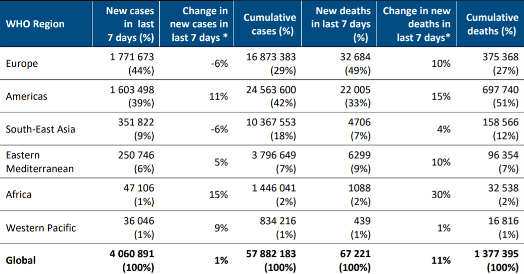 ➡️ 疫情肆虐全球至少 #191 国/地区,截至今早8am,美国约翰斯·霍普金斯大学实时统计:全球累计确诊新冠肺炎病例59,620,502例,累计死亡1,406,283例。
