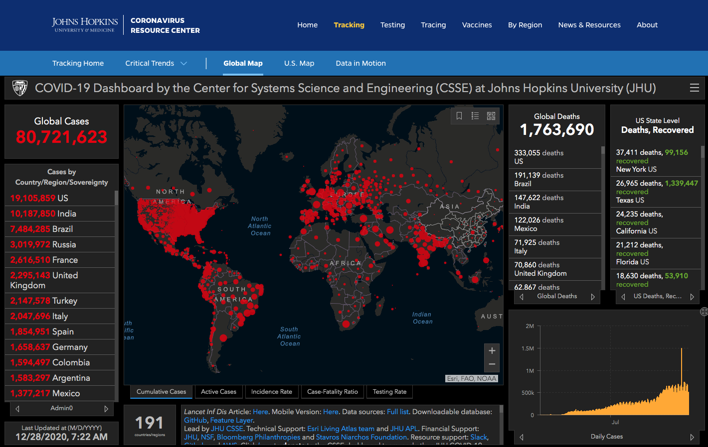 ➡️ 疫情肆虐全球至少 #191 国/地区,截至今早8am,美国约翰斯·霍普金斯大学实时统计:全球累计确诊新冠肺炎病例80,721,623例,累计死亡1,763,690例。