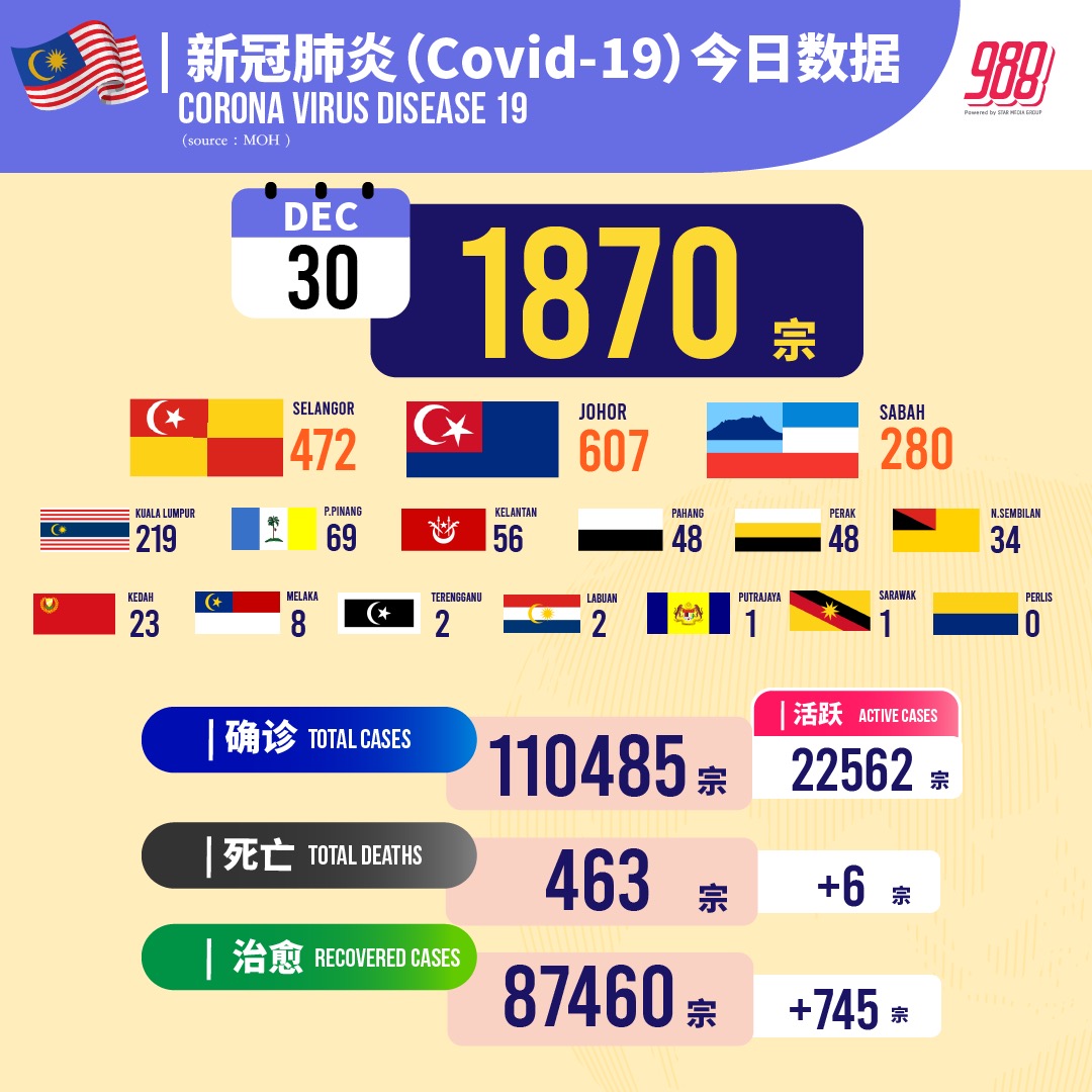 ➡️截至30日12pm,我国新增确诊 #1870例,累计病例至今 #110,485例,添6死亡病例,累计 #463死,境外输入#2例, 本土感染病例为 #1868例。