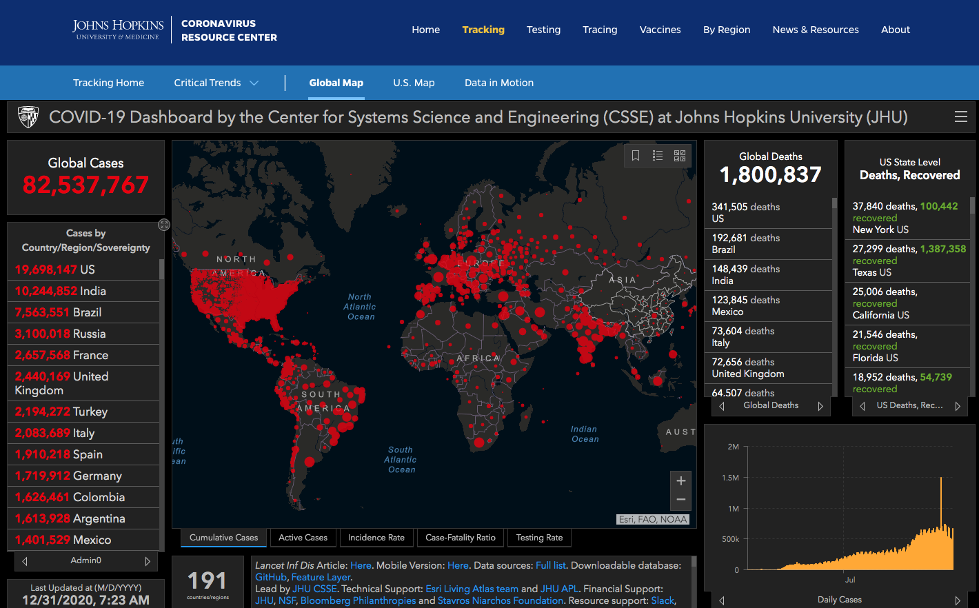 ➡️ 疫情肆虐全球至少 #191 国/地区,截至今早8am,美国约翰斯·霍普金斯大学实时统计:全球累计确诊新冠肺炎病例82,537,767例,累计死亡1,800,837例。