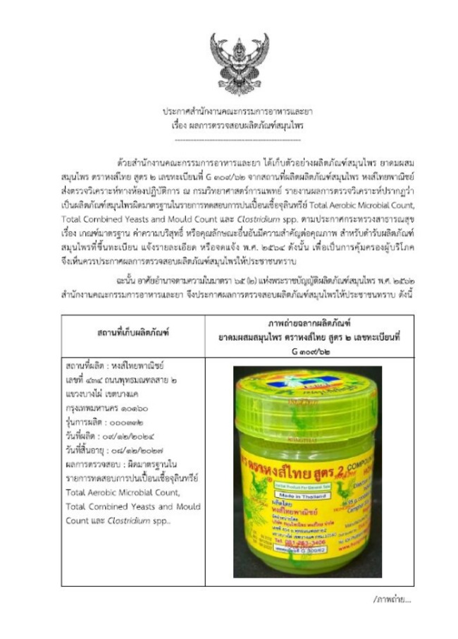 《看见泰国VisionThai》报道,泰国食品药物管理局在官方公告指出,“Hong Thai草药鼻通第2配方”(注册号G 309/62)中,需氧菌总数、酵母菌与霉菌数量皆不符合标准,甚至检出致病细菌“梭状芽孢杆菌”(Clostridium spp.)。问题批次为编号000332,生产日期为2024年12月9日,有效期限至2027年12月8日。