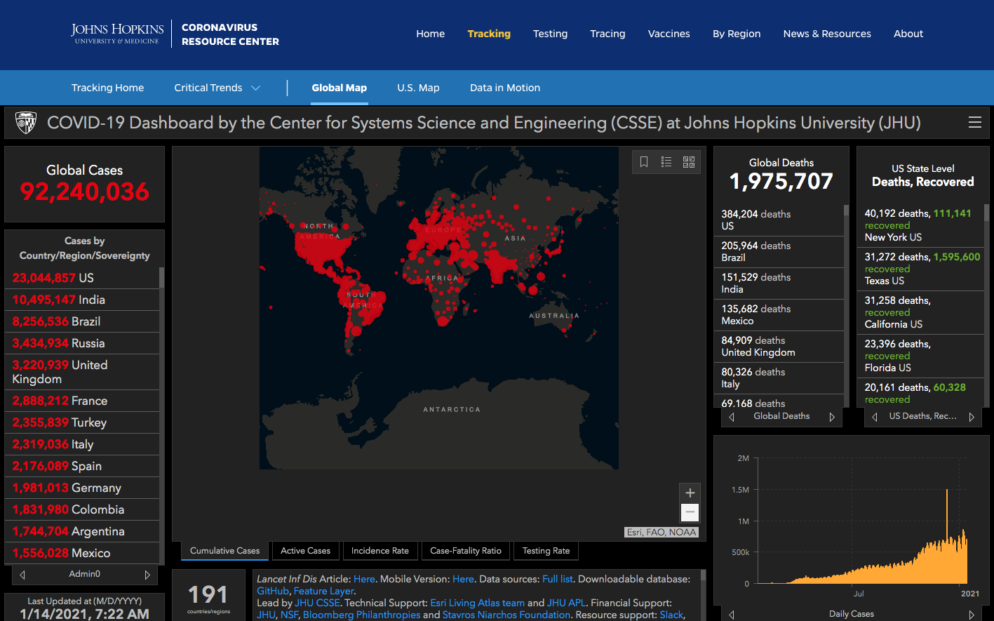 ➡️ 疫情肆虐全球至少 #191 国/地区,截至今早8am,美国约翰斯·霍普金斯大学实时统计:全球累计确诊新冠肺炎病例92,240,036例,累计死亡1,975,707例。