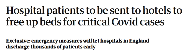 ➡️英国首席医疗顾问警告称疫情“最坏时期”即将到来,英国国家医疗服务体系(NHS)担忧医院届时会人满为患,计划实施一项“极具争议”的应急措施,即打算让数千名患者提前出院,住到酒店或自己家中,以腾出床位给重症患者。同时,NHS还要求护理中心开始接收来自医院的患者,只要隔离14天无症状即可,无需最近的核酸检测报告。