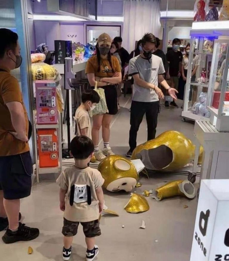 男童在不小心弄坏这个售价5万2800港币(约3万令吉)巨型公仔后,其父母经商议下赔了成本价的3万港币,现场图片一经上网,立刻引来很多网民的讨论,当中有认为弄坏了家长就应该要赔钱,但也有些觉得店家应该固定好这个大玩偶。