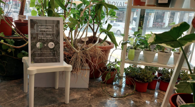 新加坡这家植物旅馆 “Leaf Me Up”坐落在惹兰勿刹的一家酒店内,负责人黄勇达称,酒店老板让他免费在一个角落经营植物旅馆,而他则在下班后前往照顾植物。