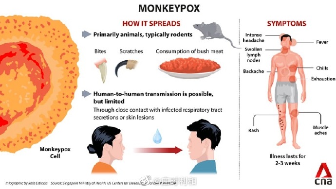 什么是猴痘?猴痘是一种病毒性人畜共患病。猴痘病毒可通过密切接触由动物传染给人。虽不易发生人际传播,但与患者密切接触也可能感染。人感染猴痘初期症状包括发烧、头痛、肌肉酸痛、背痛、淋巴结肿大等,之后可发展为面部和身体大范围皮疹。多数患者会在数周内康复,但也有患者出现严重症状甚至死亡。