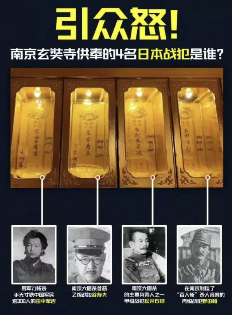 《澎湃新闻》报道,网友向媒体和南京宗教部门提交拍摄画面,图片中能看到4名曾是二战战犯的已故日本军人名字,除了上述三人、另有一人叫田中军吉,时任中队长的他手持军刀,在南京斩杀战俘与平民300多人,全被著作以文字记录,最终战后接受国际法庭审判,在雨花台被判处死刑。