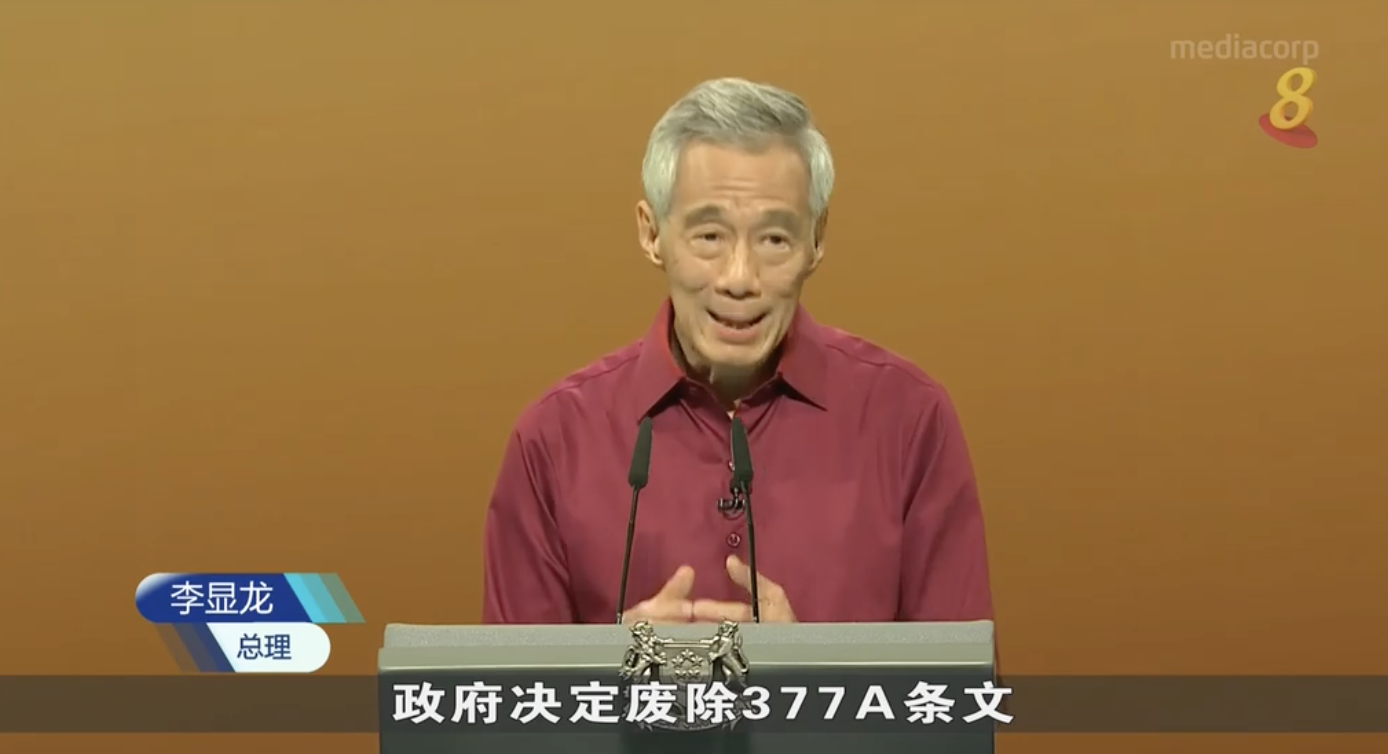 李显龙在国庆群众大会上说:“政府决定废除377A条文,男性之间的性行为不违法,我相信这是对的,多数新加坡人如今也接受。”