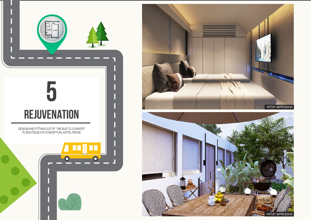 根据贵宾旅运的介绍,这个巴士度假村将占地大约8600平方米,当局将把20辆退役公共巴士升级再造,改装成度假村客房,住宿费预计每晚介于300到400新元(约1000令吉)左右。