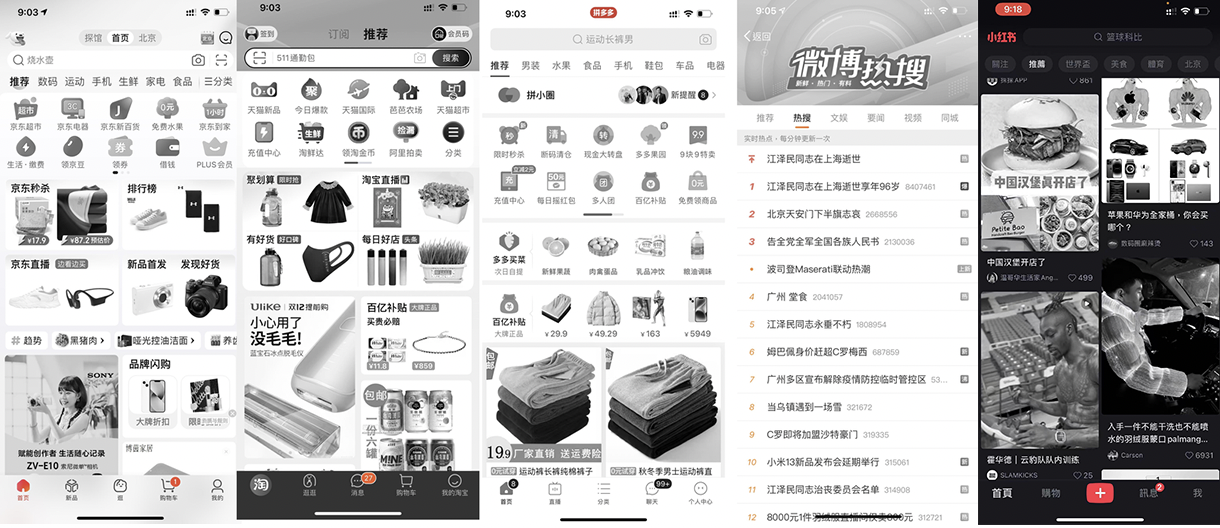 接着,社交平台微博的热搜榜单,以及爱奇艺、网易云、支付宝、淘宝、京东、拼多多、美图秀秀、哔哩哔哩等多个领域的民众惯用APP与网站介面,甚至连小红书的页面都变成了黑白色。