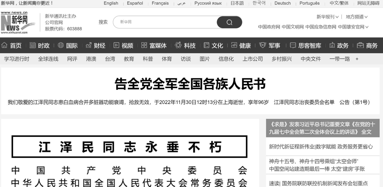 前中国国家主席江泽民因白血病合并多重器官衰竭病逝,享寿96岁,中国人皆对此消息感到哀伤,国家主席习近平形容对方为“伟大的无产阶级革命家”;而官媒、政府机关网站甚至是网购平台、社交媒体软件,也陆续换成“黑白色调”悼念。