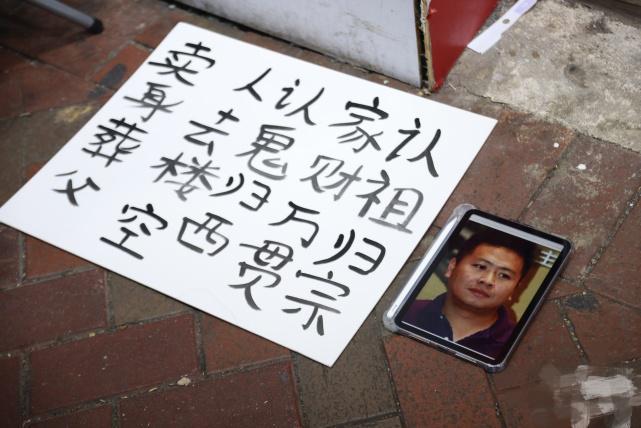 综合港媒报道,昨天下午,一名女子出现并坐在旺角亚皆老街及西洋菜南街交界,只见她身穿花花长裙、白色外套,手持某名牌手袋,其身旁摆有一幅字牌,以白底黑字写著“认祖归宗、家财万贯、认鬼归西、人去楼空、卖身葬父”20个简体大字,旁边平板电脑放著一张男人的照片,疑似其亡父。