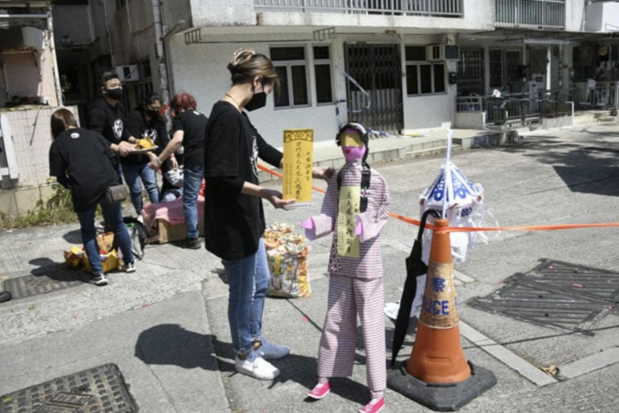 周二也是蔡天凤遇害后的头七,龙尾村案发现场村屋外大批死者的亲友到场,他们带备纸扎公仔及香烛等祭祀用品进行路祭。路祭以道教仪式进行,有道士在场打斋超渡。