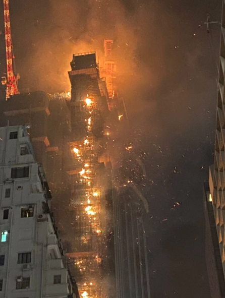 香港尖沙咀一座施工中的高楼,昨晚11时11分发生大火,高楼层位置突然冒出火光,火势凶猛,浓烟升上半空,整栋大厦犹如火柱,警方在今凌晨1时46分将火警升高到四级,旁边最少5幢大厦被火屑波及,共170人要疏散。火警焚烧逾9小时,最终于(3日)早上8时30分大致被救熄。