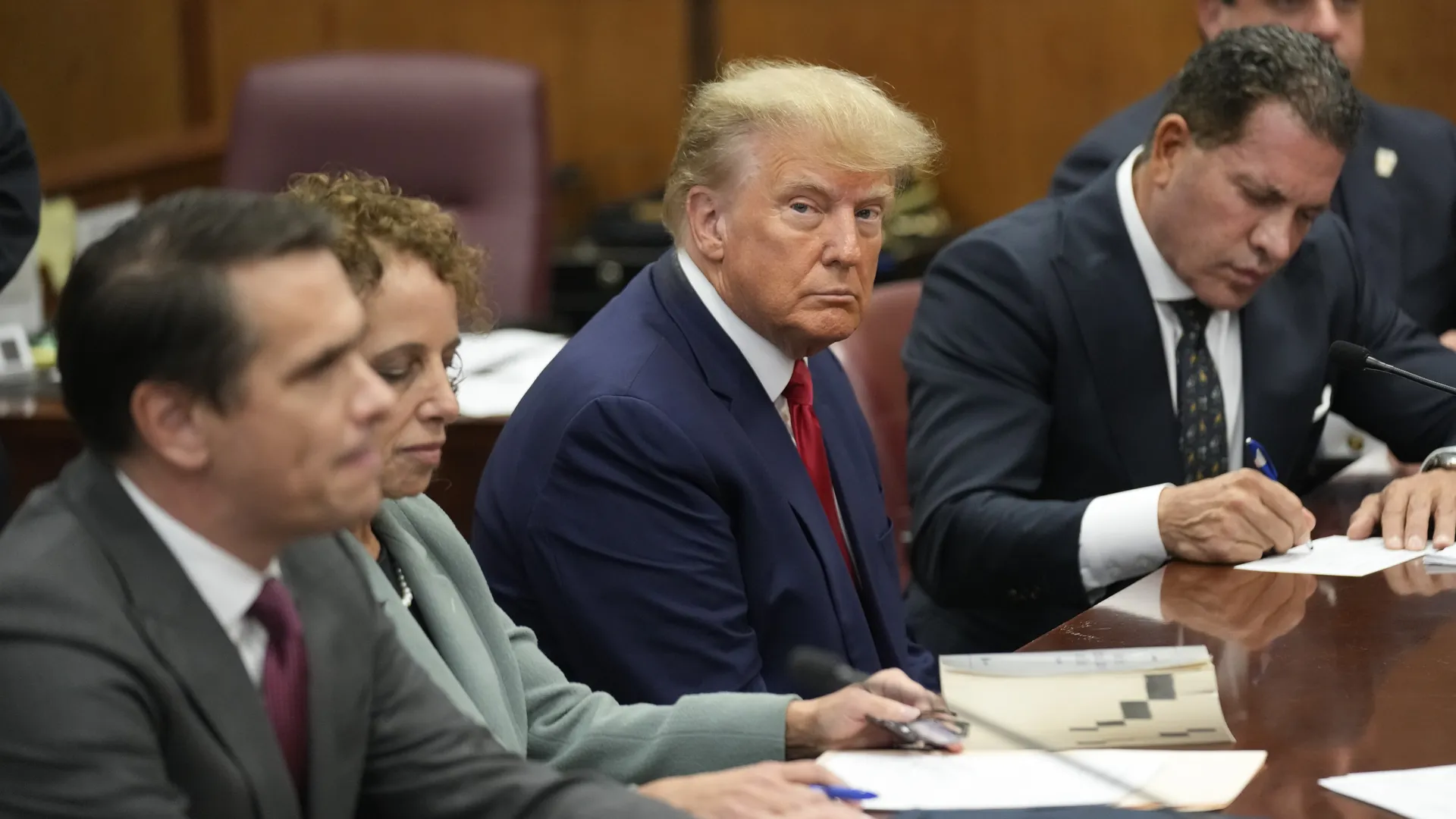 特朗普当地时间星期二下午抵达曼哈顿刑事法院,登记相关信息后进入法庭,并未佩戴手铐。