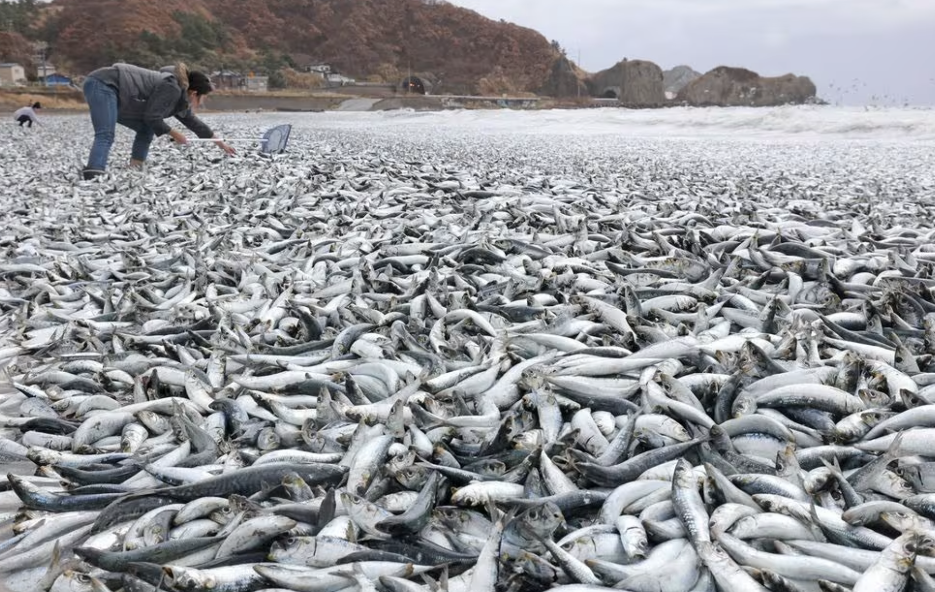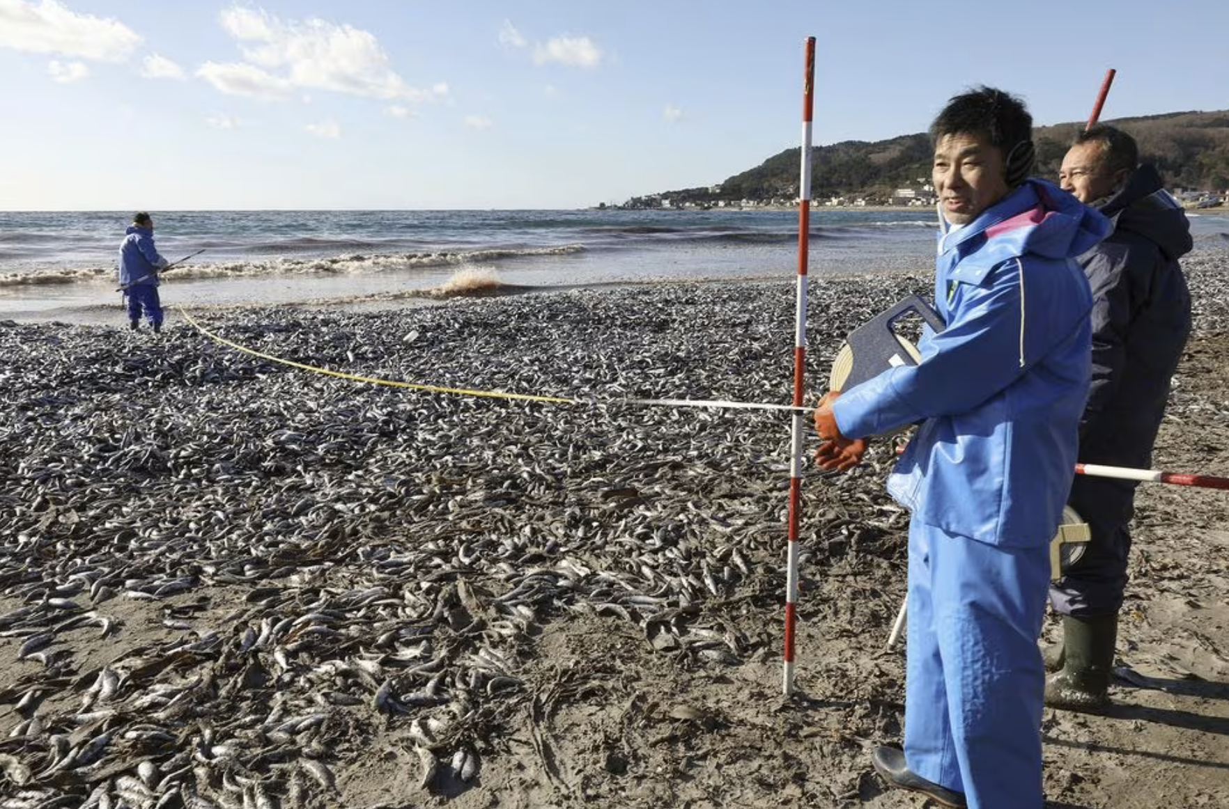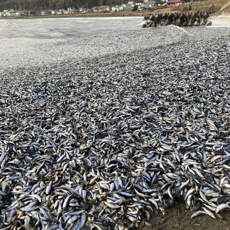 日本北海道函馆市是在本月7日被发现海滩上,有大量沙丁鱼和鲭鱼被海浪冲上岸,长达1.5公里海岸线上布满大量鱼尸,散发阵阵恶臭。有专家推测鱼群可能是被海豚等大型海洋动物追逐至岸边,最终导致大量搁浅。