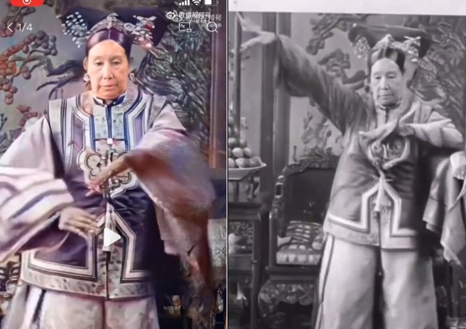 慈禧太后“跳科目三”短片仅长约8秒钟,黑白画面呈现,主要是以慈禧太后其中一张流传最广的黑白照片作基础,原本端坐镜头前摆拍的慈禧,被人用AI生成技术加工,变成站在宫殿内手舞足蹈的“热舞太后”。