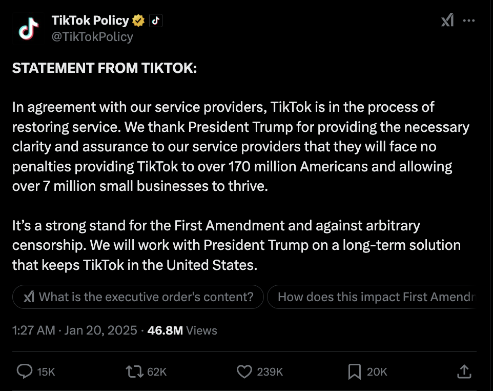 TikTok也在X上发表相关声明,并点名感谢特朗普。“根据与服务提供商的协议,TikTok正在恢复服务。感谢特朗普总统给予我们的服务提供商必要的澄清和保证,使他们不会因向超过1亿7000万美国人提供服务、让700多万小企业蓬勃发展而受到处罚。