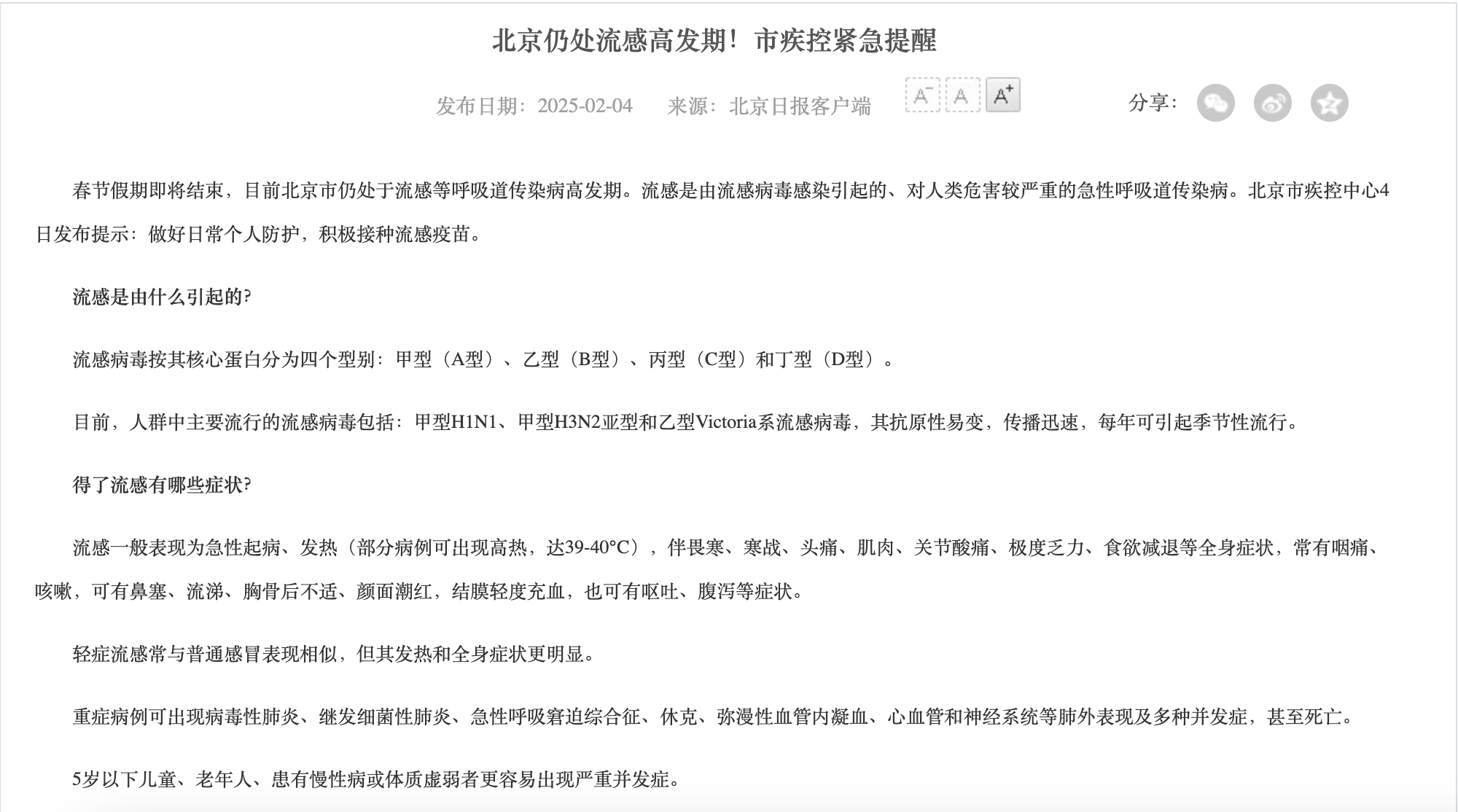 另一方面,以北京疫情来说,北京疾控中心日前指出,北京市仍处于流感等呼吸道传染病高发期。流感是由流感病毒感染引起的、对人类危害较严重的急性呼吸道传染病