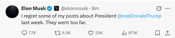 他写道:“我对自己上周发的关于总统特朗普的一些帖文感到后悔。它们太过了。”