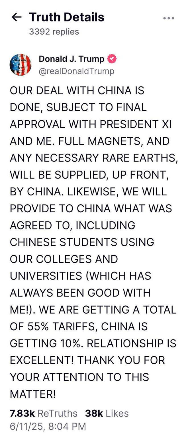 特朗普是当地时间11日在其社交平台Truth Social贴文称:“我们与中国的协议已经完成,但需经习近平主席和我最终批准。”