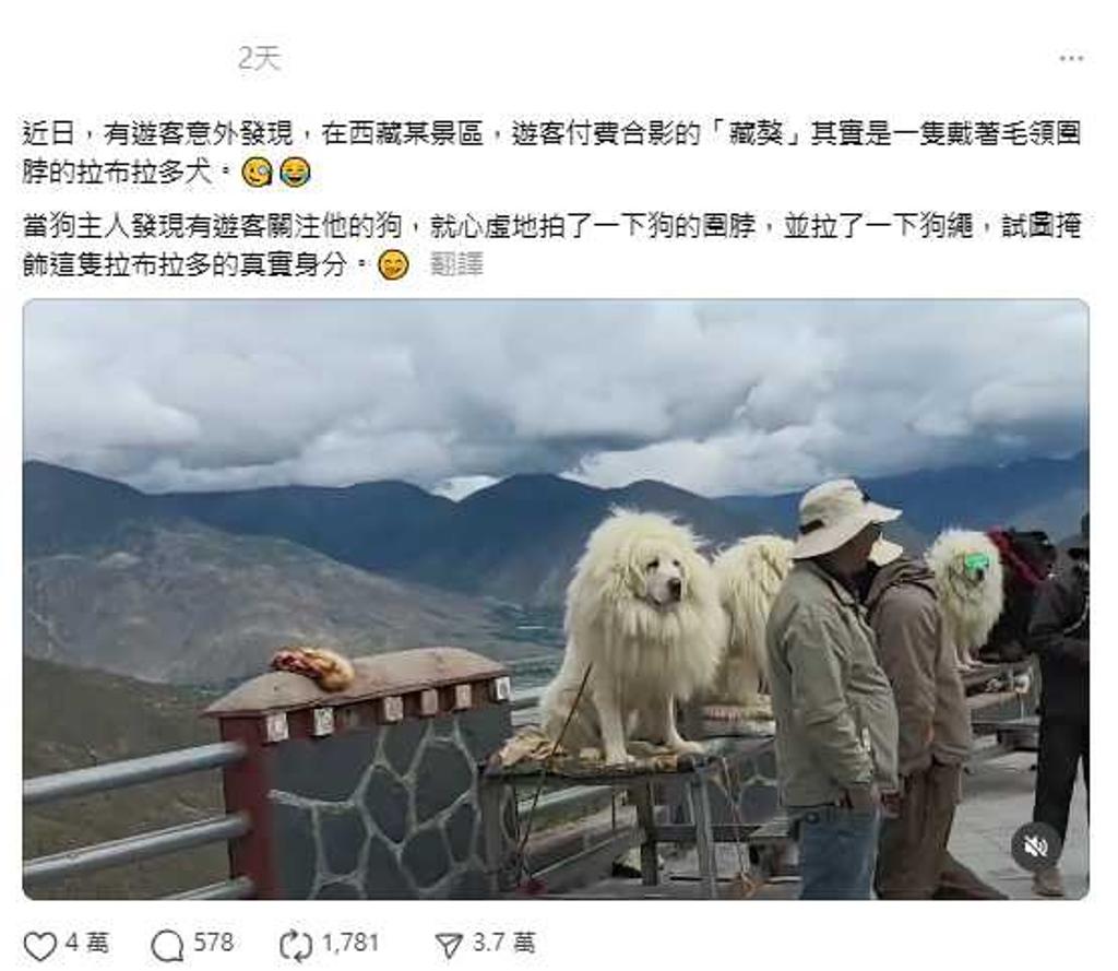 事件起因是一名张姓游客在日前把一段拍摄影片上传社媒,画面显示一只疑似藏獒的犬只,实际上是拉布拉多。她在镜头前笑问:“你不是拉布拉多套了个圈吗?”而一旁疑似狗主的男子在察觉被拍后,迅速试图掩盖,拉扯牵绳并拍打围脖,举止尴尬。
