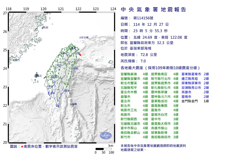 台湾宜兰外海昨晚11时05分发生7.0级深层地震,震源深度约72.8公里,全台多地明显有感。