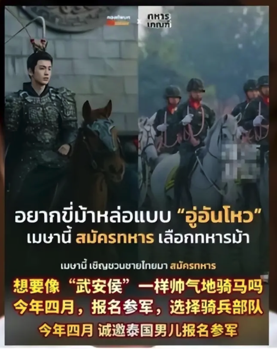 综合中国媒体报道,泰国一张征兵海报直接使用剧中“武安侯”骑马的画面,并配文:“想像武安侯一样帅气骑马吗?今年4月报名参军,选择骑兵部队”,以幽默方式吸引年轻人关注。
