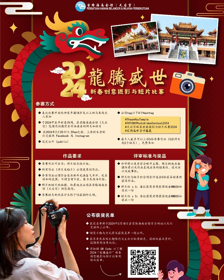 🏮今年除了推荐打卡地点外,特别举办“新春创意摄影与短片”比赛;优胜者将有机会获得奖金和奖状,快来参与吧,不要错失这个绝佳机会!