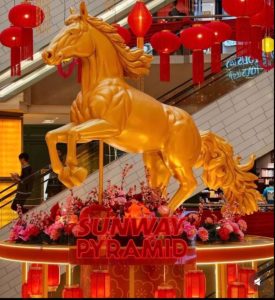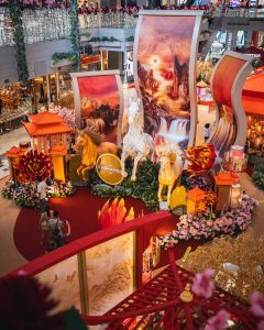 1 Utama以气势恢宏的新春装饰迎接马年的到来,整体设计融合传统中式美学与现代商场空间布局,除了红灯笼高挂、古代拱桥设计,还有巨型孔雀摆设及金色元素点缀其间,营造出喜庆而不失典雅的节庆氛围。
