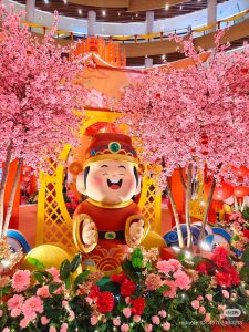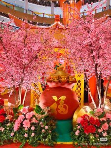 说到打卡点,当然少不了环绕整个中庭的粉色樱花树、超大的Q版财神爷和巨型“福”字钱袋,满满春意超出片!