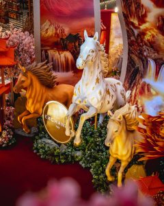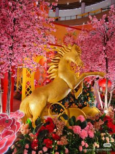 有别于去年的“丝绸主题”,The Exchange TRX今年主打“力量感、现代艺术、新中式奢华”风格。以“骏马腾飞 Year of the Horse”为题,三匹骏马气势全开,再搭配金色细节与玉石感山峦背景,并以桃花、牡丹稍作点缀,简单高级风一下被带出来了!