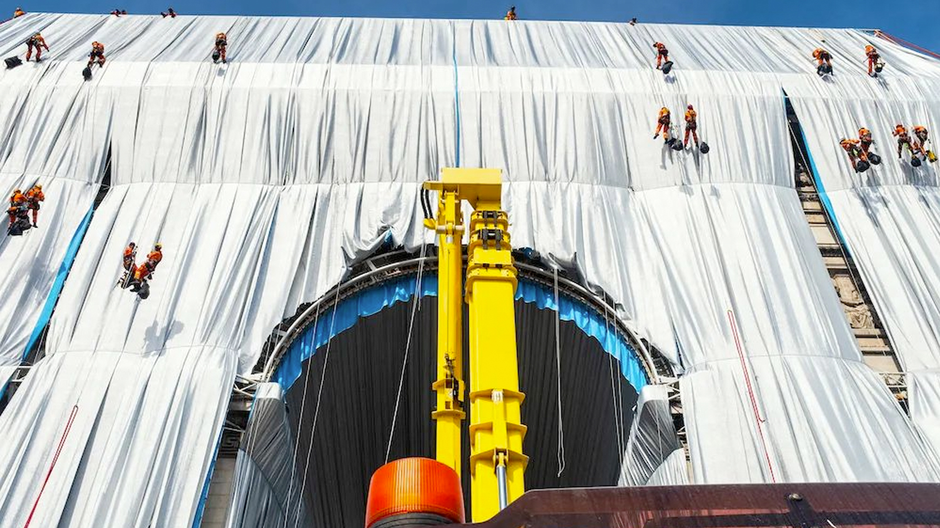 整个包裹过程看似简单,准备工作却复杂,首先要测量凯旋门的真实尺寸,确保结构和防风不出问题;为保护凯旋门建筑,施工团队还在浮雕外搭建一层“保护外壳”。
