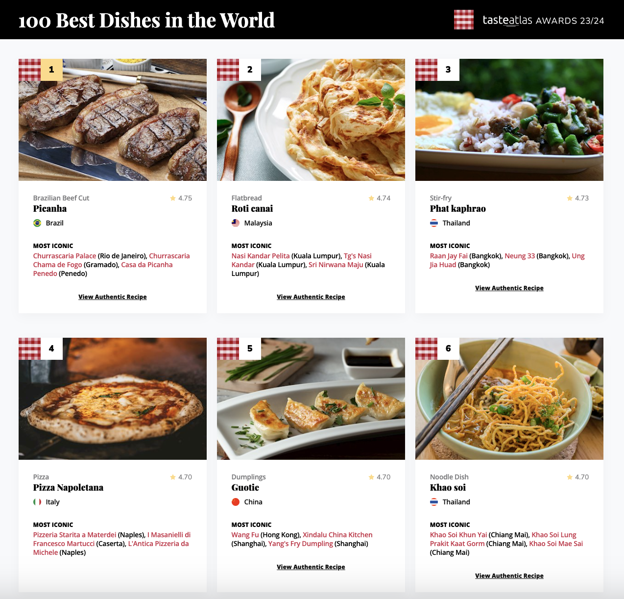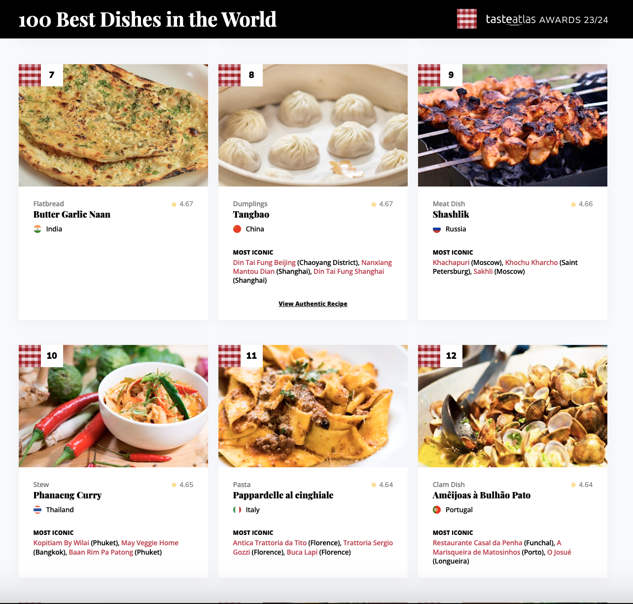 TasteAtlas声明中说,这次共记录了39万5205份(有效27万1819份)菜肴评分和11万5660份(有效8万863份)食品产品评分。