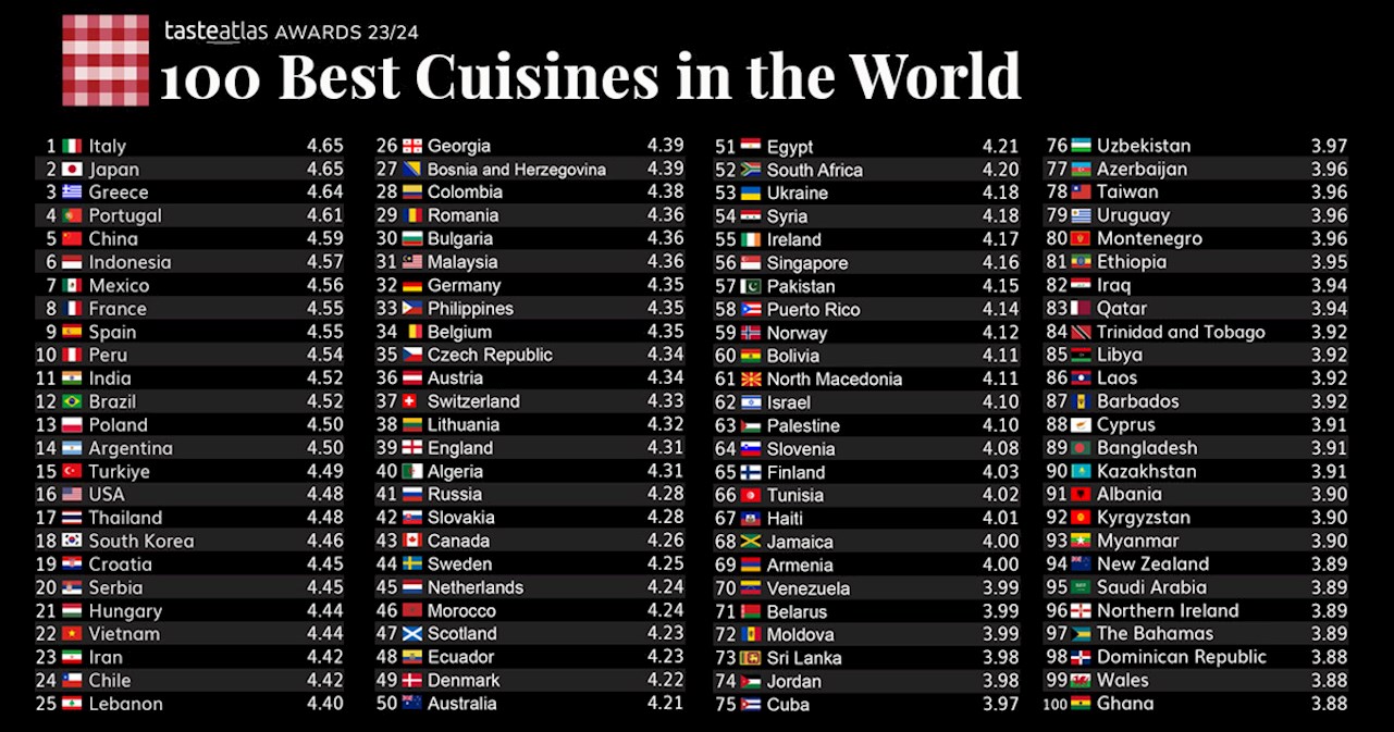 在最佳美食菜系方面,评分标准是提取每种菜系前50种食物,并根据每个国家最佳菜肴和食品产品平均评分,对全球最佳菜系进行排名。