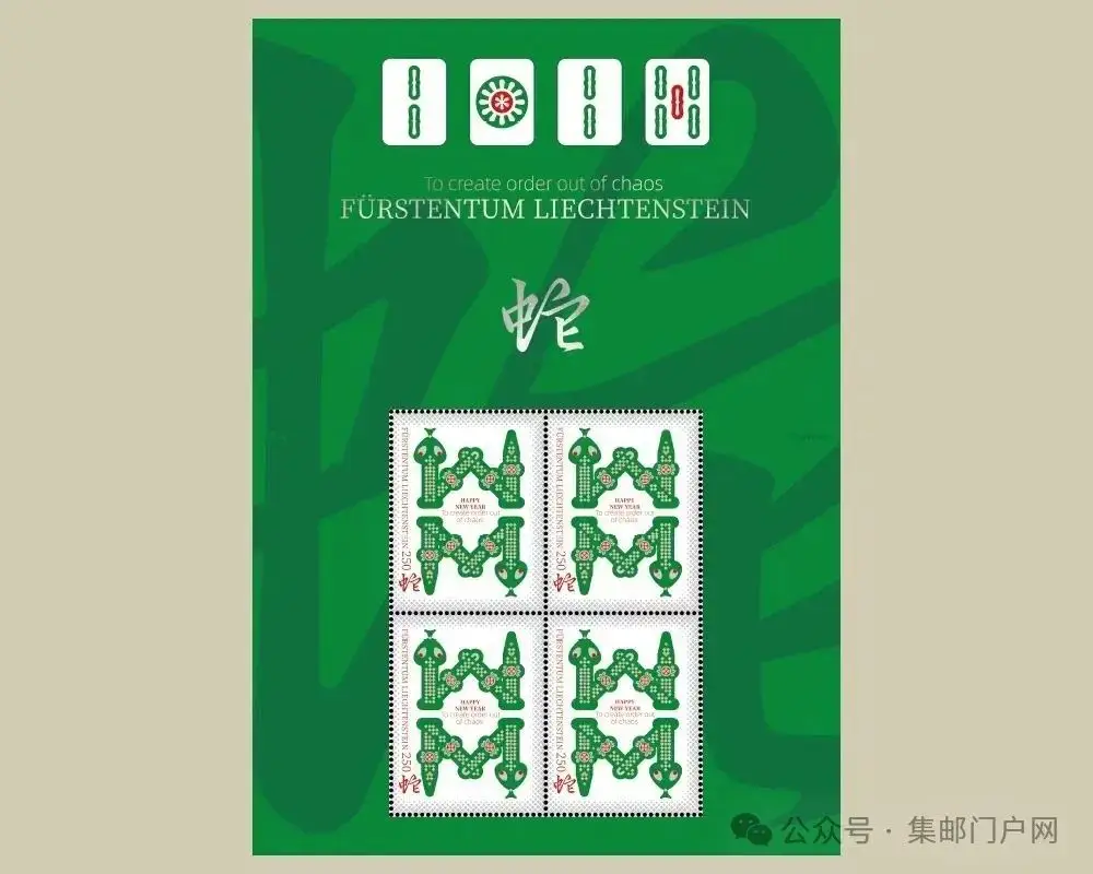 “邮票王国”列支敦士登,今年的蛇年邮票以设计精致及十分有趣,它把两种中国传统元素结合在一起——“蛇”与麻将牌中的“八条”相结合。