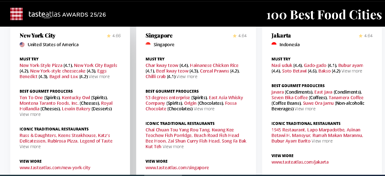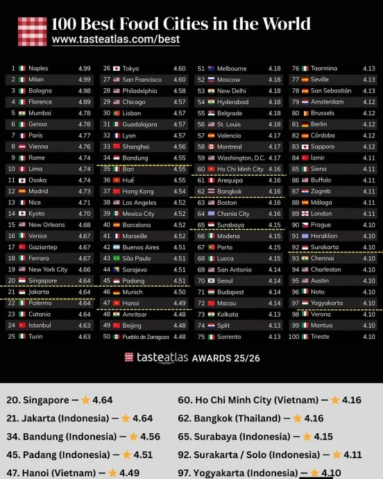 全球美食评鉴平台 TasteAtlas 公布了 2025/2026 年度“全球100大最佳美食城市”排行榜,东南亚共有 10 座城市成功入选,其中新加坡以第 20 名领跑区域榜单。印尼、越南和泰国分别有 6 座、2 座及 1 座城市上榜,反观一向以美食闻名的大马却全军覆没,引起本地网民一片哗然。