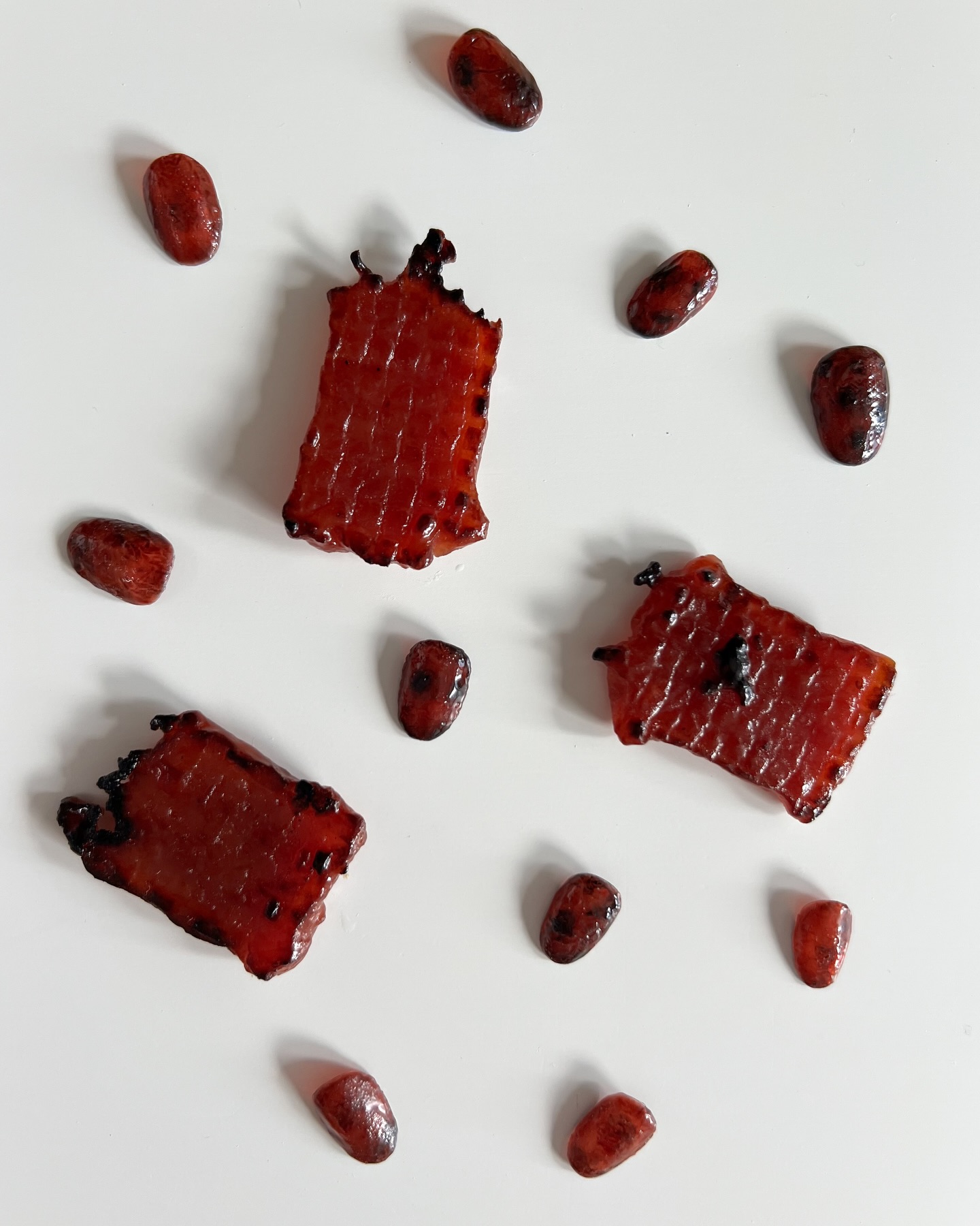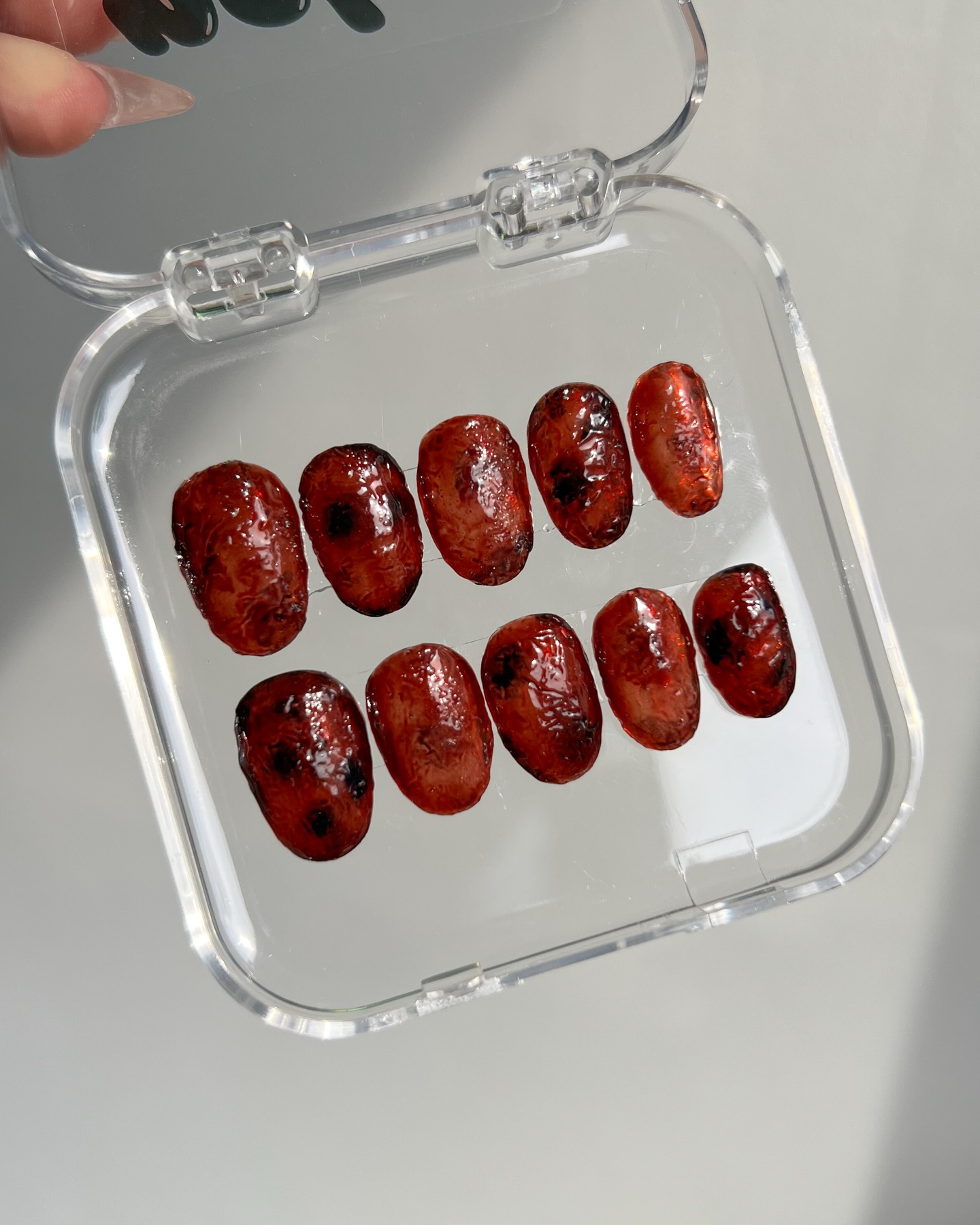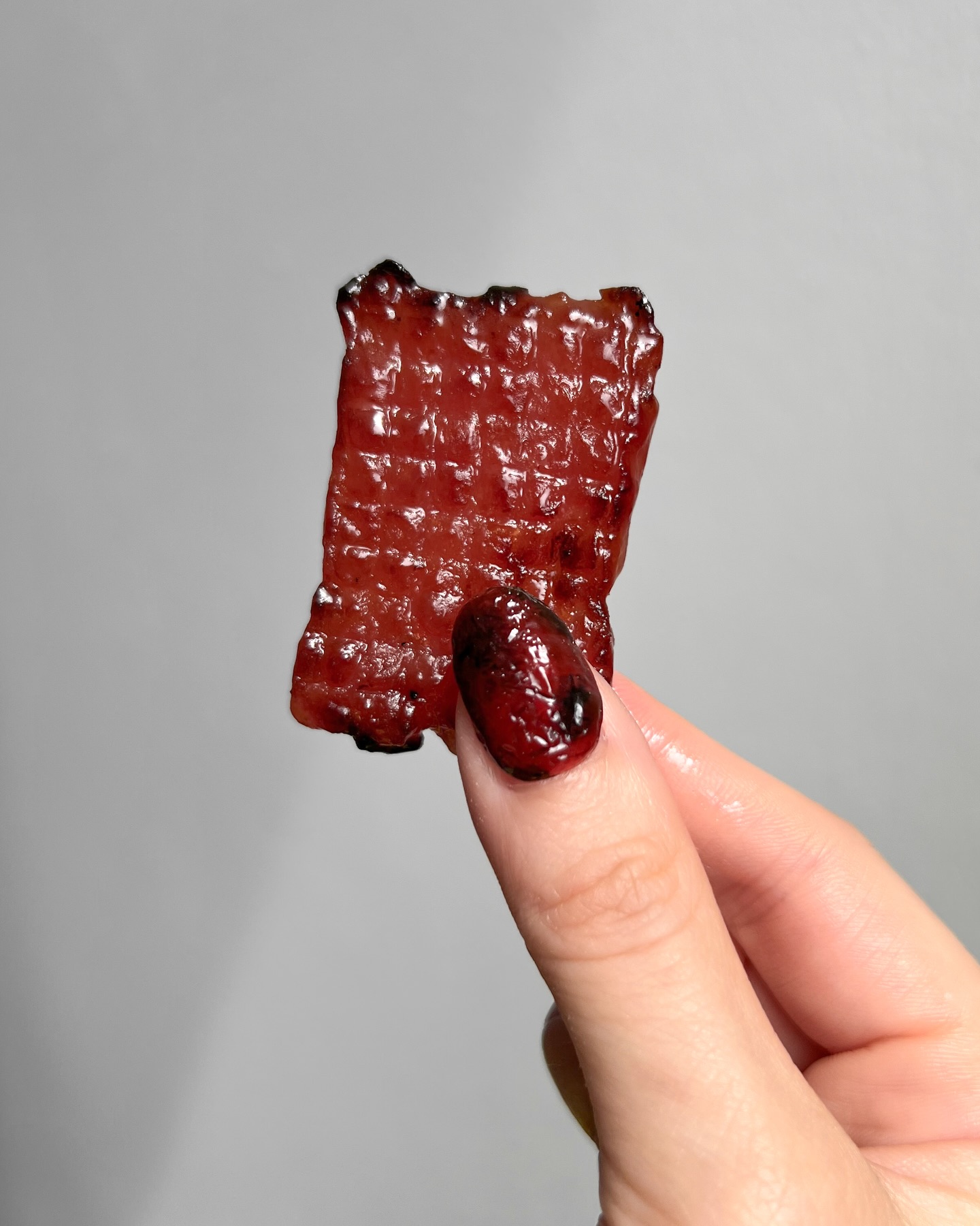 这款美甲设计的亮点在于其高度还原的视觉效果:色泽红润,带有焦糖光泽,炭烤纹理细致入微,乍一看仿佛将迷你烤肉片贴在指尖。