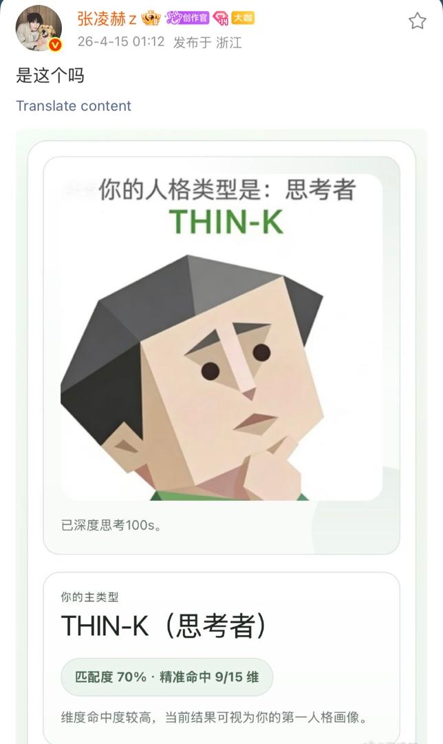 张凌赫15日通过微博超话分享自己的SBTI结果为“思考者”,被认为与其MBTI类型ISTP相呼应。
