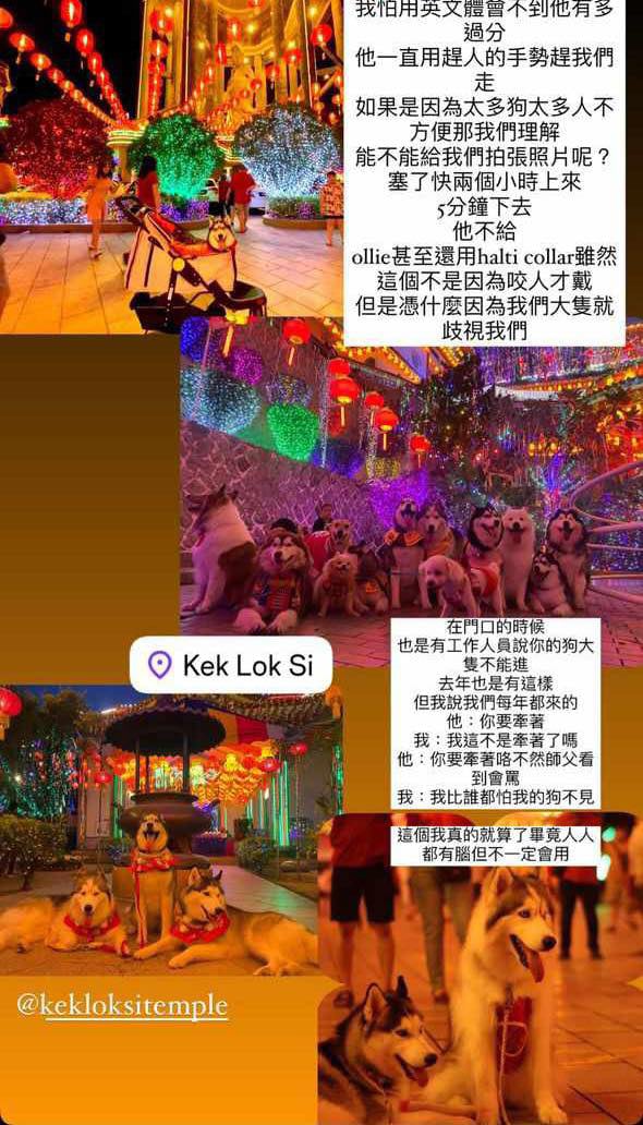 事主接受《星洲日报》访问时表示,她和朋友昨晚带着几只大狗逛极乐寺,她带着三只哈士奇,她先抵达并带着狗只闲逛拍照。
