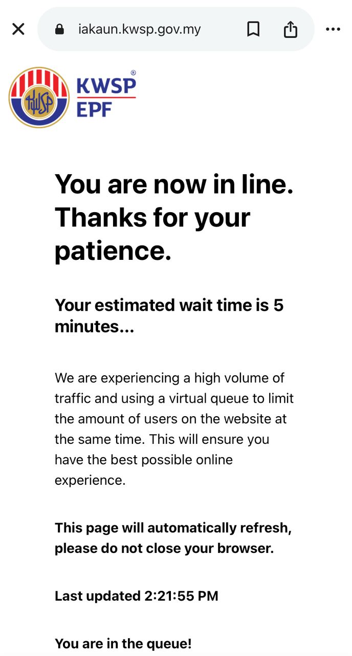 由于访问量激增,EPF系统出现“排队”等待的情况,截至下午2时20分,在线“排队”等待时间约5分钟。