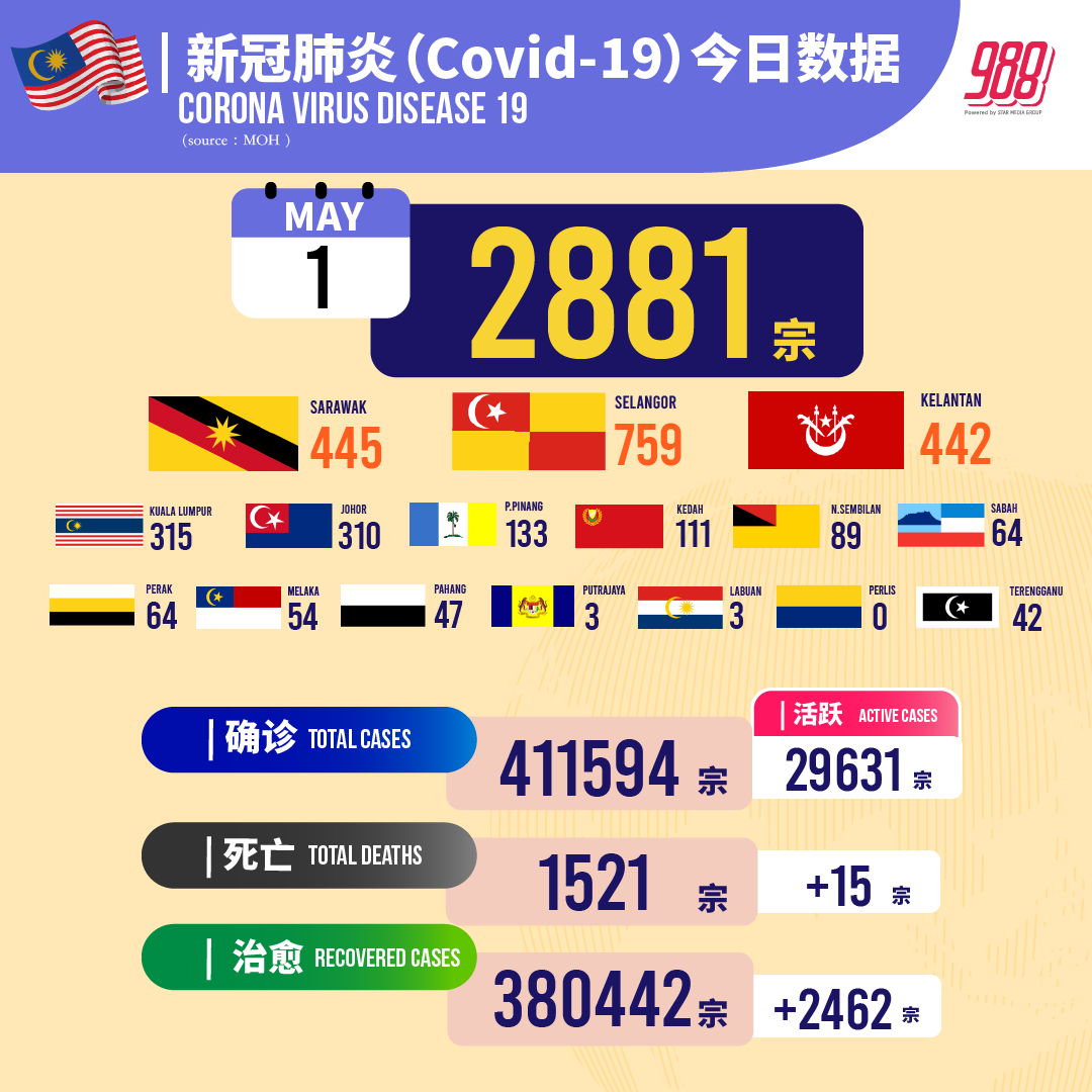 卫生部通报,截至1日12pm,我国新增 #2,881例,累计病例至今 # 411,594宗,新增 15死累计#1,521死。